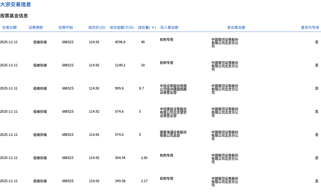 11月11日,佰维存储大宗交易成交73.52万股,成交额8448.92万元,占当日总成交额的2.01%,成交价114.92元,较市场收盘价127.5元折价9.87%。